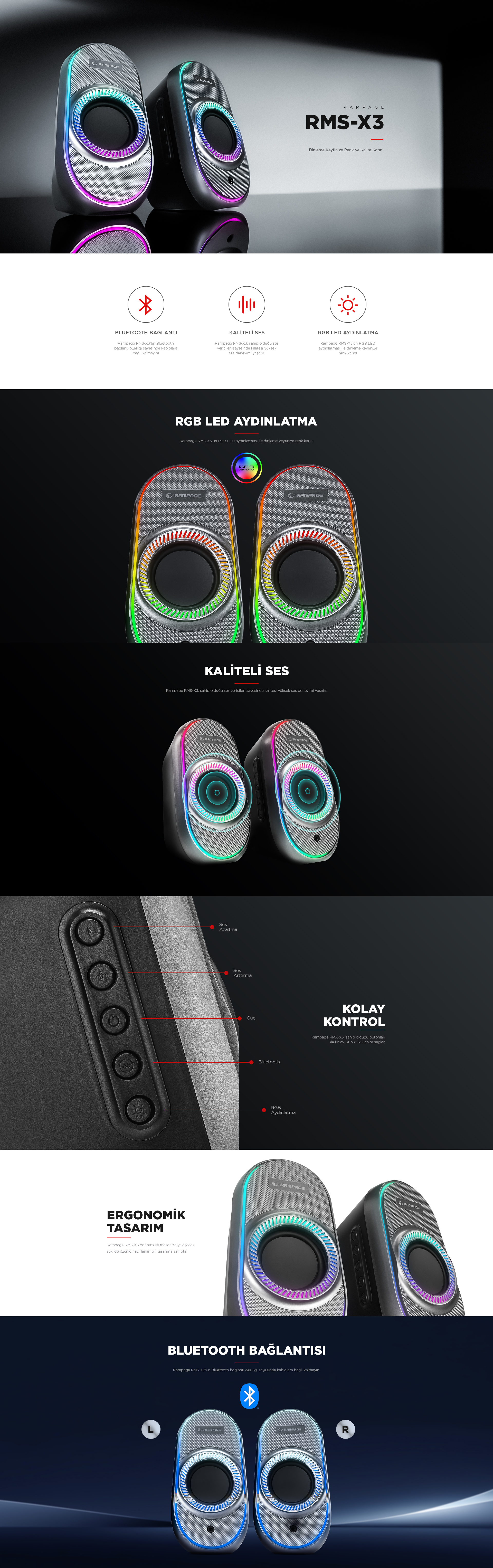 ✨ Rampage RMS-X3 2.0, RGB ışık efekti, güçlü ses ve esnek bağlantı seçenekleri ile oyun ve multimedya keyfinizi artıran ideal bir hoparlördür! 🎮🔊💡